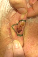 Hier sehen Sie ein Basalzellkarzinom, welches bereits 1/3 der Ohrmuschel befallen hat.